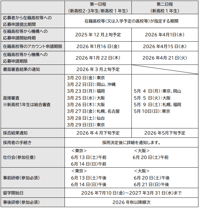 →在籍高校等から機構への応募申請期限は、第一日程が2026年1月22日(木)、第二日程(新高校1年生)の場合2026年4月21日(火)までとなります。ただし、これ以前に担当の先生は応募内容の確認やアカウント申請などをする必要があります。そのため以下2点を必ず早い段階で行いしょう。学校の提出期限を確認せず、実際の応募申請期限と勘違いして急いで完成させたという話を聞きます。まずは学校先生に相談&期日の確認です!