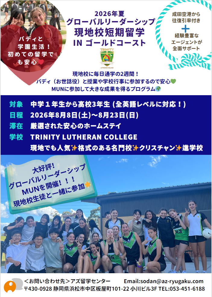 オーストラリア・ゴールドコーストで開催される中学生&高校生のため大人気、現地校体験プログラム!毎年夏に開催される本プログラムは早い段階で満席となる人気プログラム。成田空港から日本人スタッフの引率が付き、現地でも日本人スタッフが一丸となってサポートをしてくれるこちらのプログラムは、初めての留学!という方にも大変安心で満足度の高い内容となっています。プログラムはゴールドコースト屈指の名門校トリニティルーサンカレッジにて開催。机上の英語学習のみでなく、「バディ」と呼ばれる現地校の生徒がパートナーを組んで留学生と交流。音楽、スポーツ、そして生きたSDGSを学ぶなど、あらゆる場面で英語の壁を超えた人との繋がりを深めていきます。オーストラリアで学園生活を思う存分楽しめるプログラム内容です!
