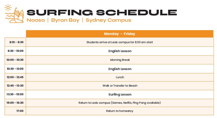 オーストラリア内に6キャンパス持つLexisが開催する毎年人気の短期ジュニアプログラム。午前中の英語授業終了後のサーフィンレッスンは資格を持つ経験豊かなインストラクターが、サーフィン好きな方はもちろん、サーフィンの経験がない方もチャレンジできるよう楽しく指導してくれます。
