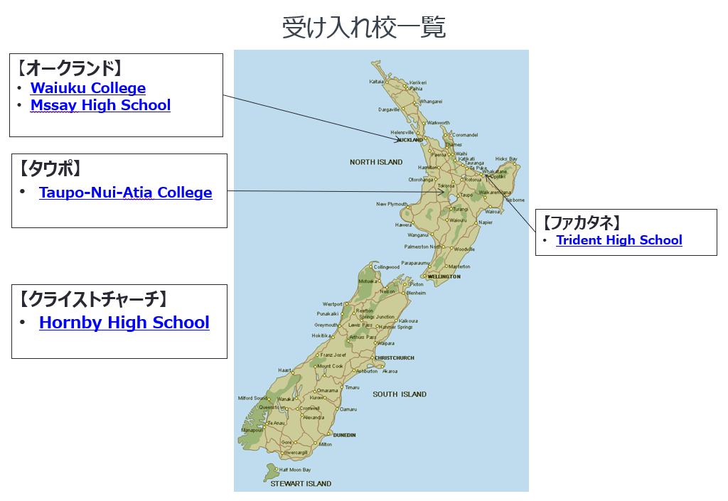 ※Trident High Schoolに行かれる方は、国内線でTaurangaまで、HornbyはChristchurchまでご予約下さい。