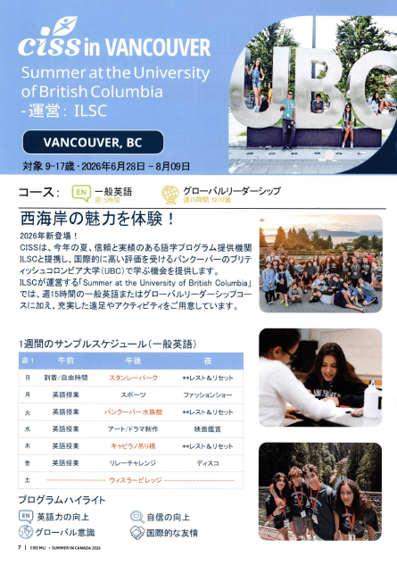 CISSは、今年の夏、信頼と実績のある語学プログラム提供機関ILSCと提携し、国際的に高い評価を受けるバンクーバーのブリティッシュコロンビア大学(UBC)で学ぶ機会を提供します。