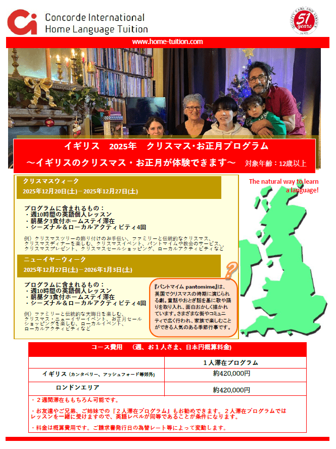 イギリスのカンタベリーにある老舗語学学校「コンコルド・インターナショナル(Concorde International)」が、冬休みの特別ホームステイプログラムを開催!12歳以上であればお子さまから大人のお客様まで、どなたでも参加可能です。 弊社でも大人気のティーチャーズホームステイプログラムがクリスマス・お正月のホリデー仕様に様変わり。先生の家に滞在し、完全プライベートレッスンで集中的に英語学習が出来る従来の魅力はそのままに、クリスマスツリーの飾りつけやニューイヤーショッピングなど、本場のホリデーシーズンを満喫できる特別プログラムとしてアップグレードされています! ★ホリデーシーズンのため受け入れファミリーに限りがあります。お早目にお問合せ・お申込ください!