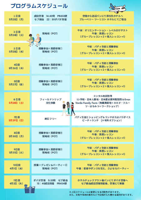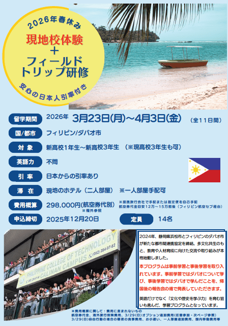 本プログラムは、高校生対象の春休み留学プログラムです。フィリピンの私立高校での現地校体験(授業に参加)・英語学習(クラスレッスン&マンツーマンレッスン)に加え、日本との深い繋がりのフィリピン-ダバオ市の歴史や平和教育、ダバオの豊かな自然環境の中でルーツやカカオ無農薬で育てている農場見学やそこでのワークショップなど、SDG’sの体験学習など、教育的なフィールドトリップが含まれています。また、同世代の現地の高校生がバディ生徒として、皆さんの留学をバックアップ!休日も一緒に出掛けたりなど、楽しく学習しながら、ダバオを満喫していただくプログラムとなっています。日本からの引率(日本人)と現地のパートナーオフィスの日本人による24時間緊急サポート付きですので、初めての海外、初めての留学の方にも安心してご参加いただけます!親日的なダバオ市の高校生と一緒に、楽しく有意義な留学を体験してみませんか?英語力は問いませんので、ぜひ挑戦してみてください!