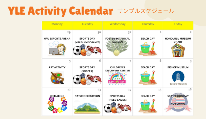英語レッスンは、祝日を除く月曜~金曜日の午後1時20分から5時までです。インタラクティブな課題や歌、ゲーム、パズルなどを通して、年齢の低い生徒さんが興味を持ちながら、楽しく学習しやすい環境で英語を学ぶことができます。 オプションの午前のアクティビティでは、楽しくカジュアルな環境で世界中から来たクラスメートと交流し、英語を使いながら新しいお友達を作ることができます。ビーチでのアクティビティ、フラレッスン、ダイヤモンドヘッドでのハイキングなどをはじめとする、ハワイならではのエキサイティングなアクティビティが待っています。