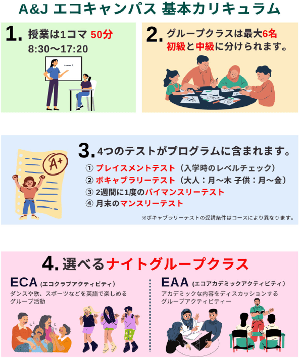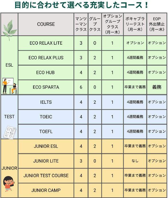 | ・JUNIOR ESL(7歳〜16歳) | マンツーマンクラス4コマ+グループクラス2コマ |
