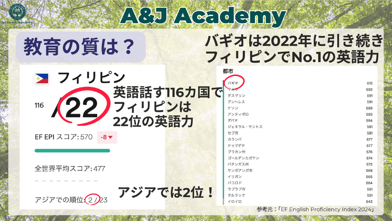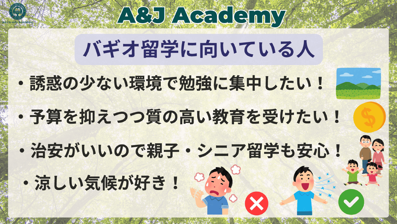 自然に囲まれたバギオ郊外で完全オーダーメイド授業。 ワーホリ準備コースが大人気!選べるスパルタ/セミスパルタ