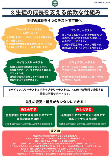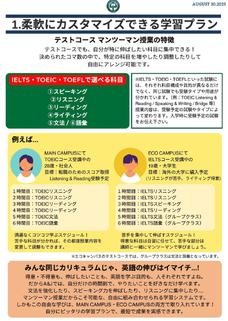 | ・INTENSIVE ESL | マンツーマン6コマ+無料グループ1コマ+ボキャブラリーテスト1コマ |